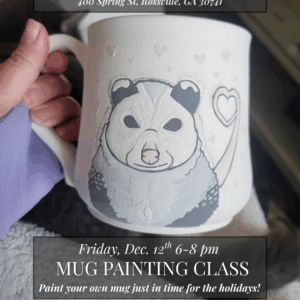 Have you ever been curious about how ceramic artists add imagery to their pieces? Would you like to bring home a hand-painted mug? Join us for a basic surface design overview and hand-painting session on Friday, December 12th, and bring your very own mug home just in time for the holidays! The first 15 to 20 minutes will provide a brief overview of the life cycle of pottery and its impact on surface design application, with the remaining time allocated for you to paint to your heart’s content. The mugs will be available for pickup a few days later.